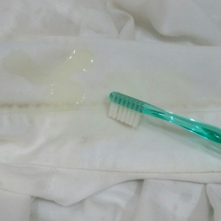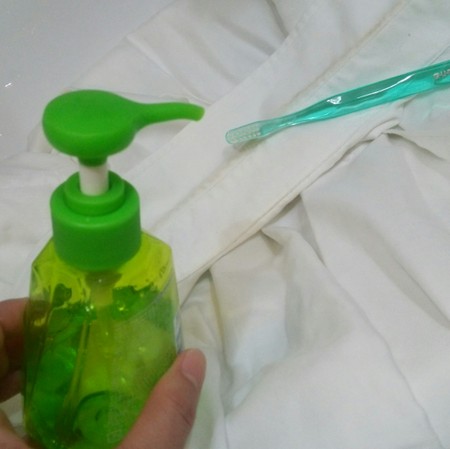 洗剤を塗るように、軽く擦るだけでみるみる落ちます。あまり強く擦ってしまうと生地をいためてしまうと思うので、注意してくださいね。
