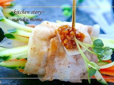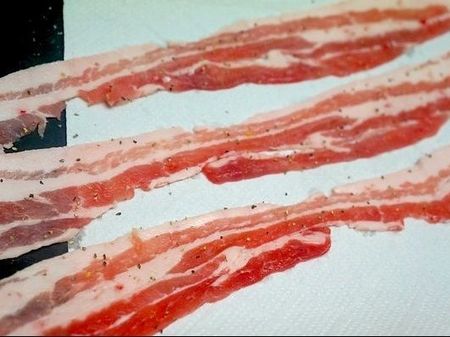 私は豚バラ肉を塩・ブラックペパーを適宜振りオイル無しでフライパンで12枚焼きました。