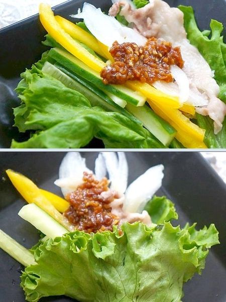 家で食べる時に、レタスにガーリック味噌だれと豚肉、野菜を包んで『レタス巻き』も簡単で食べ易いです。