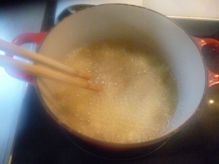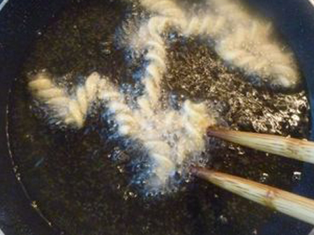 揚げるときに8個から10個を目安にパスタを180度の揚げ油で揚げる。