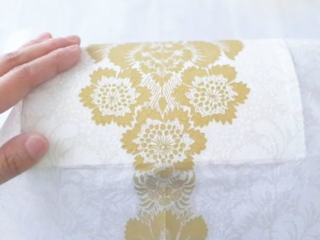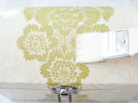 金具部分を避けてデコパージュ液を塗り、ペーパーを貼りつけます。