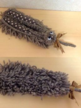 見た目も可愛いものを、と完成したモップを見ていたら、ウサギの耳に見えてきたので、顔をつけてウサギモップにしました。