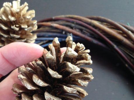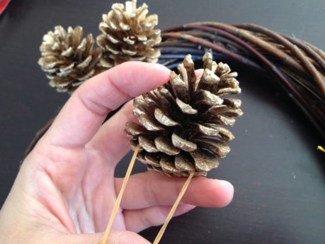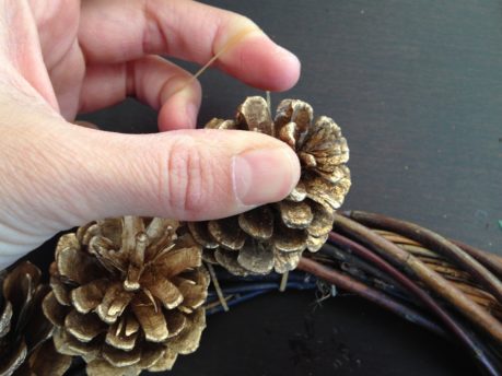 柳のリースの好きな位置に、松ぼっくりを固定していきます。固定するときに使うものは….??