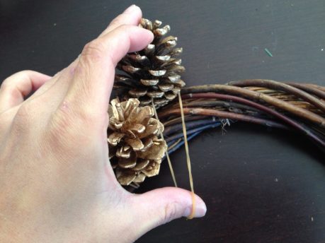 松ぼっくりに引っかけた輪ゴムを引っぱり、リースのまわりを一周させます。