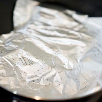 裏返したら、アルミホイルでふたをして中までじっくり火を通します(フライパンのふたでも結構です)。