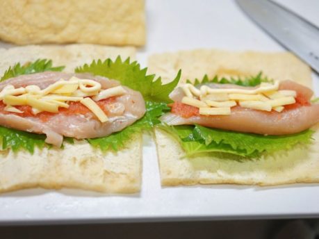 開いた油揚げの内側のまん中より少し手前に大葉2枚→開いた鶏のささ身1枚、明太子1/5腹分→シュレッドチーズ&マヨネーズをのせます。