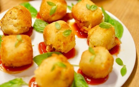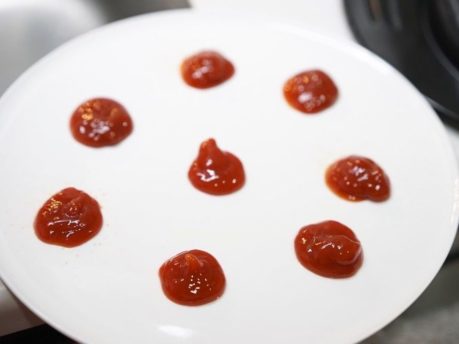 揚げて油をきったコロッケをトマトケチャップの上に盛りつけます。