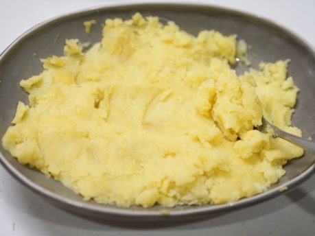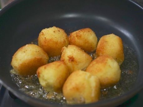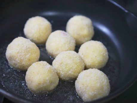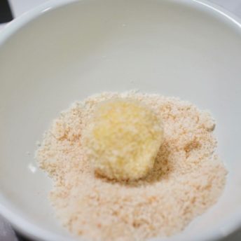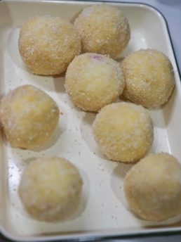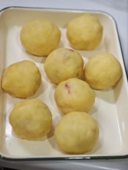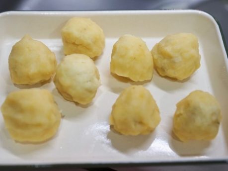 マッシュしたじゃがいもは8等分にして丸めておきます。マヨネーズでしっとりしていますが、油分が足りずに、手にくっつくようならサラダ油などを手につけて丸めます。