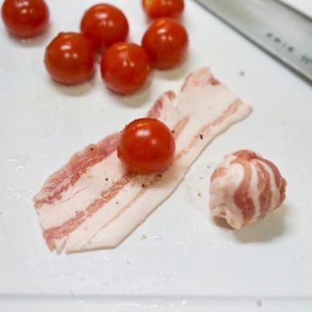 豚バラ肉は半分の長さにカットして、塩をしてミニトマトを巻いていきます(写真では真ん中にトマトを置いていますが、端から包むように巻いてください)。巻き終えたら、清潔な手でキュッキュッとやさしく握って豚肉とトマトを接着させます。