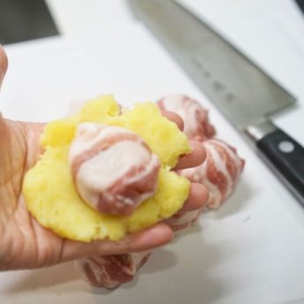 写真のように、一度丸めたマッシュしたじゃがいもを広げて手のひらに乗せて、真ん中に豚トマトを置きます。