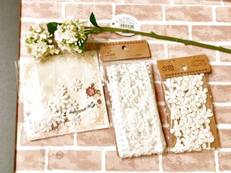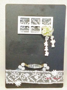ブラックボードに、レースやミニウィンドウフレーム、造花をくっつけます。