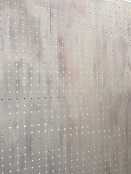 つっぱり棒とボードを結束バンドで固定します。ボードの穴を通した結束バンドは、すべりどめシートのまん中でとめるようにすると安定します(写真、真ん中に来ていませんが、、)。