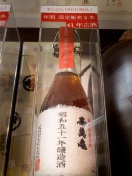 この酒、年間たった二本のみの限定販売なのだが、今年の分は、あるお金持ちが二本とも買っていったそうだ。試飲などはもちろん無いが、琥珀色に熟成した実物が棚にデーンと飾られている。見るだけならタダなので、ぼくは究極的にまろやかな風味を夢想しながら、その五四万円の高貴なお姿をじっくりと拝んでおいた。