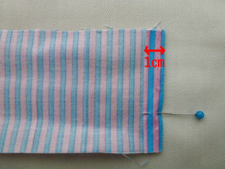 15㎝×6㎝にカットした生地を裏返して横長に置き、右端を1㎝折ります。