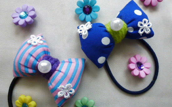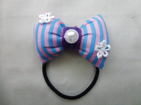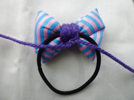 ワタを入れた生地に毛糸を合わせた、リボンヘアゴムです。