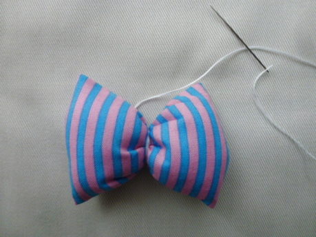 手縫いで中央をしぼり、ぐるっと糸を巻きつけ、リボン型にします。