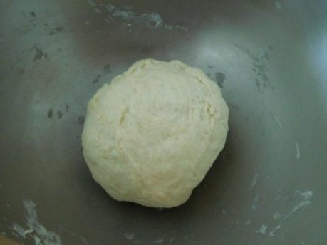 ぬるま湯を少しずつ加えて混ぜ合わせ打ちつけながら練りこみます。手に生地がつかなくなったら丸めてボウルに入れ、ぬれ布巾をかけて室温に置き、倍にふくらむまで発酵させます。