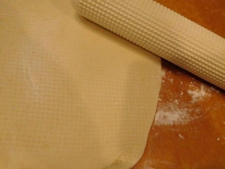 生地を半分に分け 粉をはたいた台の上に広げ麺棒で2㎜厚さにのばします。
