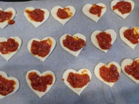 のばした生地をハート型でくりぬき、オーブンシートを敷いた鉄板に並べ、トマトソースを適量ずつのせます。