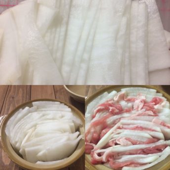 大根をよく洗い、皮つきのまま2~3㎜厚さに切って、土鍋(17㎝)に立てて詰めていきます。すき間に豚肉を入れて、だし汁を加えます。