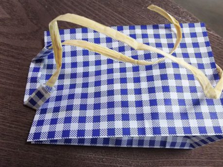 セリアで購入した紙袋。赤、黒、青がありました。お好きなものを選んでください。