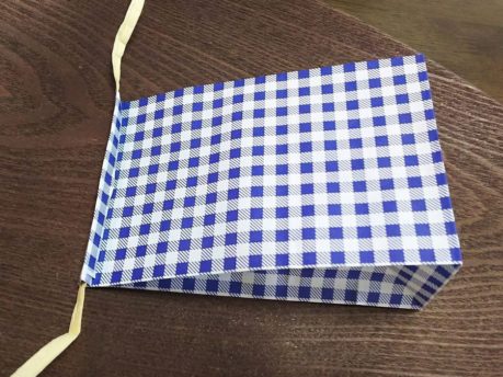 紐の長さを切り揃え、肩の部分を斜めに後ろに折ったら、できあがり。