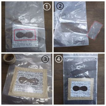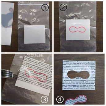 ③ピーナッツ型が、食品用保存袋の四角く切り抜いた部分のまん中にくるようにクリアファイルをのせ、マスキングテープで貼りつけます。