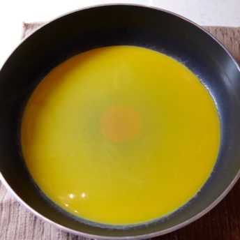 冷めたフライパンに卵液を入れます(この時点で卵の下に気泡が出るようでしたら、フライパンの温度が高いということです)。
