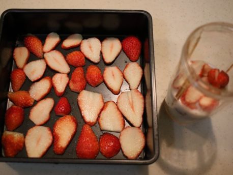 いちご(☆)は半量をスライスしてバットなどの容器に並べます。