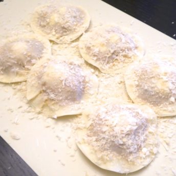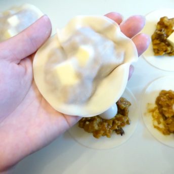 ④餃子を作る要領で皮に水をつけます