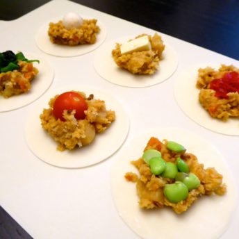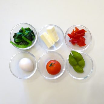 お好みの具材:うずら 卵、チーズ、ほうれん草、福神漬け、ミニトマト、枝豆など