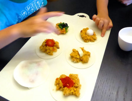 餃子の皮の上に①のカレーだねをのせて好きな具材をのせます。