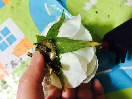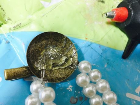 連結させたワイヤーの端を画像のように台座にのせて、グルーガンをたっぷりてんこ盛りにのせ、固まらないうちに、この上に造花をのせます。