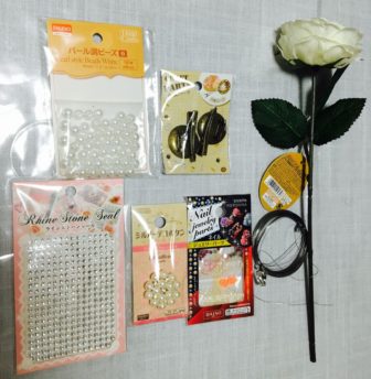 造花を飾るために、ネイル用のパーツやラインストーンを使いましたが、これもお好みで。