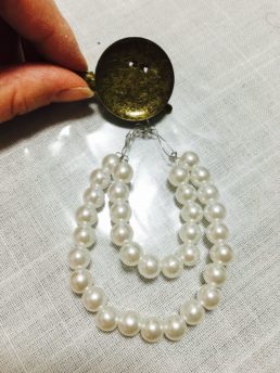 長いパールと短いパールを二重に重ねるので、まず長いパールが通せたら、両端をくくってからグルグルねじって固定、短いパールも同じようにし、その後2つのワイヤーの端を合わせてグルグルねじって連結させます。