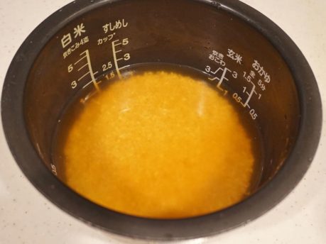 米を炊飯器の内がまに入れ、☆の調味料を入れ、だしを2合の目盛りまで注いで普通に炊きます。
