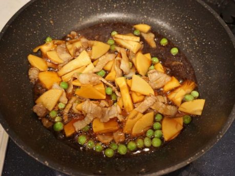 肉の色が変わったら、たけのこ、★の調味料を加えて炒め煮します。水分が少なくなったらグリーンピースを加えてさっと炒め合わせます。