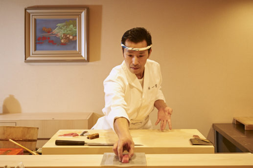カウンターの床を低めにすることで、すしを握るとき目の前のお客さんと同じ目線になるように配慮しているとか。そうした「おもてなしの心」を大切にした真摯な店主に惚れ込み、常連さんも多いそう。