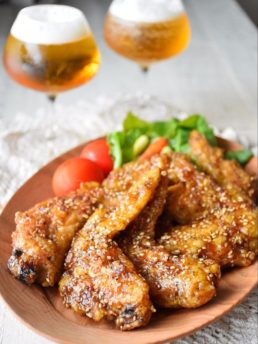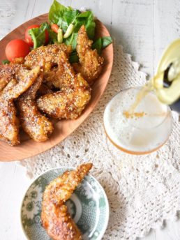 甘辛な手羽先とビールを注いでいる瞬間の画像です。