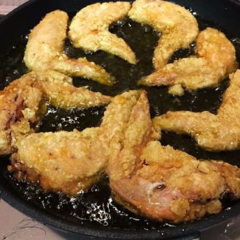 鶏肉に片栗粉をはたき、フライパンに鶏肉が1/3つかる程度のオリーブオイルを熱した中に入れ、弱めの中火で揚げ焼きにする。