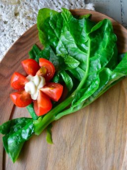その中央に、マヨネーズをのせると、野菜で作った小皿が完成。