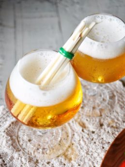 2人分のビールを注いだグラスを配置し、お皿を少し見切って主役をアップにした例です。