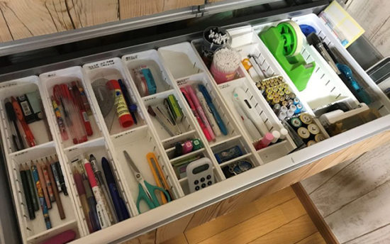 もともとは、備えつけのカトラリーケースがありましたが、収納したいものとケースのサイズが合わないので、100円ショップにあるキッチン収納グッズを用いて、家族みんなにとってわかりやすいように収めてみました。