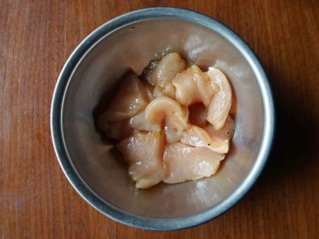 鶏むね肉は皮を除き、8㎜ほどの厚さにそぎ切りにします。ボウルに入れて☆を加えてもみ込み、片栗粉をまぶします。