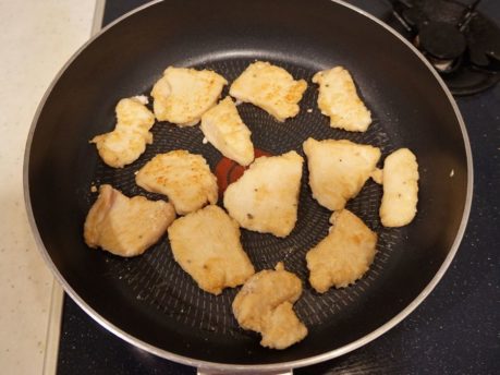 フライパンにサラダ油大さじ1をひいて、余分な粉を落とした鶏むね肉を中火で焼きます。鶏肉の色が変わったら上下を返し、両面こんがりと焼き、いったん皿にとり出しておきます。