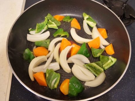 鶏肉を焼いたフライパンをさっと拭き、サラダ油少々を足して野菜を炒めます。