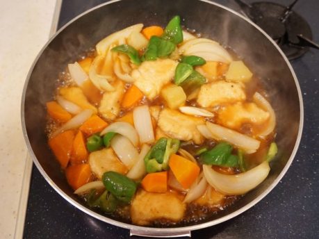 玉ねぎが透き通ったら、とり出しておいた鶏むね肉を戻し入れ、混ぜ合わせた★を加えます。お好みでカットパイン(缶詰)を加えて強火で煮立たせ、とろみがついたら器に盛りつけます。とろみが足りない場合は、水溶き片栗粉を加えてお好みのとろみをつけてください。