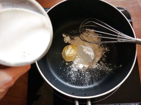 とろみがついたら火を止め、粗熱をとります(市販のホワイトソースを使ってもOKですが、ここでは使いきれる量を手作りしました。市販のものを使う場合は、150ℊを目安にしてください)。