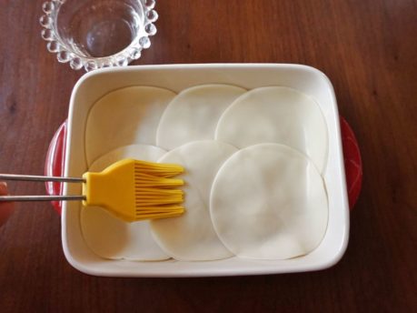 耐熱容器にホワイトソースの半量を入れて平らにならし、その上に2枚1組にした餃子の皮を6組並べます。さらにはけで薄く水を塗ります(このひと手間で、ソースとからみやすくなります)。