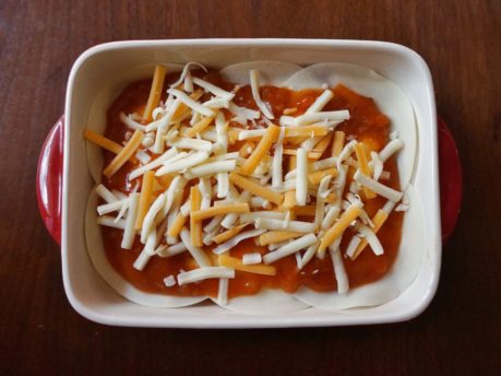 餃子の皮の上に、ミートソースの1/3の量をのせ、ピザ用チーズの1/3の量をのせます。